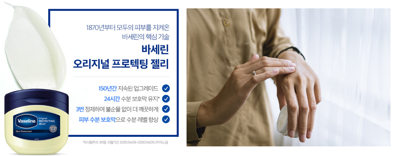 바세린은 수분을 가두는 역할을 하므로, 충분한 수분 공급이 필요할 경우 수분 크림과 함께 사용하면 효과가 훨씬 놓아집니다.